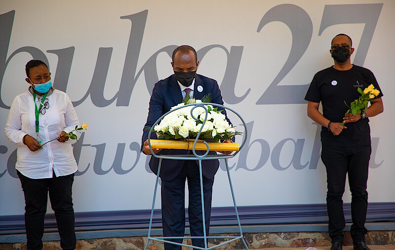 Led by Hon. Francis GATARE, the CEO of RMB, the employees laid wreaths on graves and observed a minute of silence in honour of the victims.