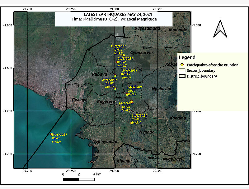 “Prior to the eruption, no seismic earthquakes (swarms) or other seismic anomalies were recorded. Seismic activities in range of magnitude 2.5 to 4 ML were only observed since the start of the eruption of the volcano and they grew in frequency an hour after eruption with epicenters located in Rubavu District, Cyanzarwe and Rubavu Sector.”